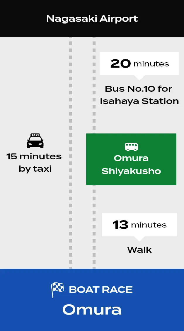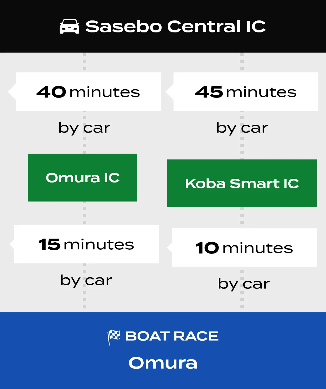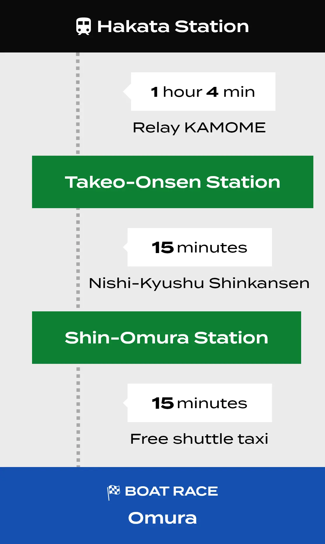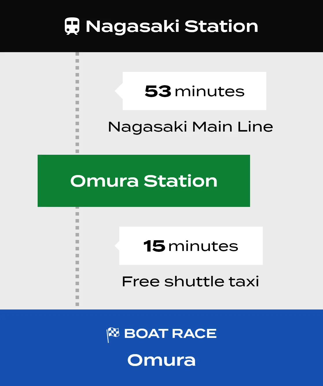 Getting to Boat Race Omura is easy and convenient, since it’s only 15 minutes by car or taxi from the Nagasaki airport! There is also a free taxi service from nearby Omura Station, so you can hop in without any hassle. Omura Station itself has easy access from both Nagasaki City and Sasebo, so you can get there from a lot of different locations. For people driving through Kyushu, the Omura Interchange (IC) makes it easy too!