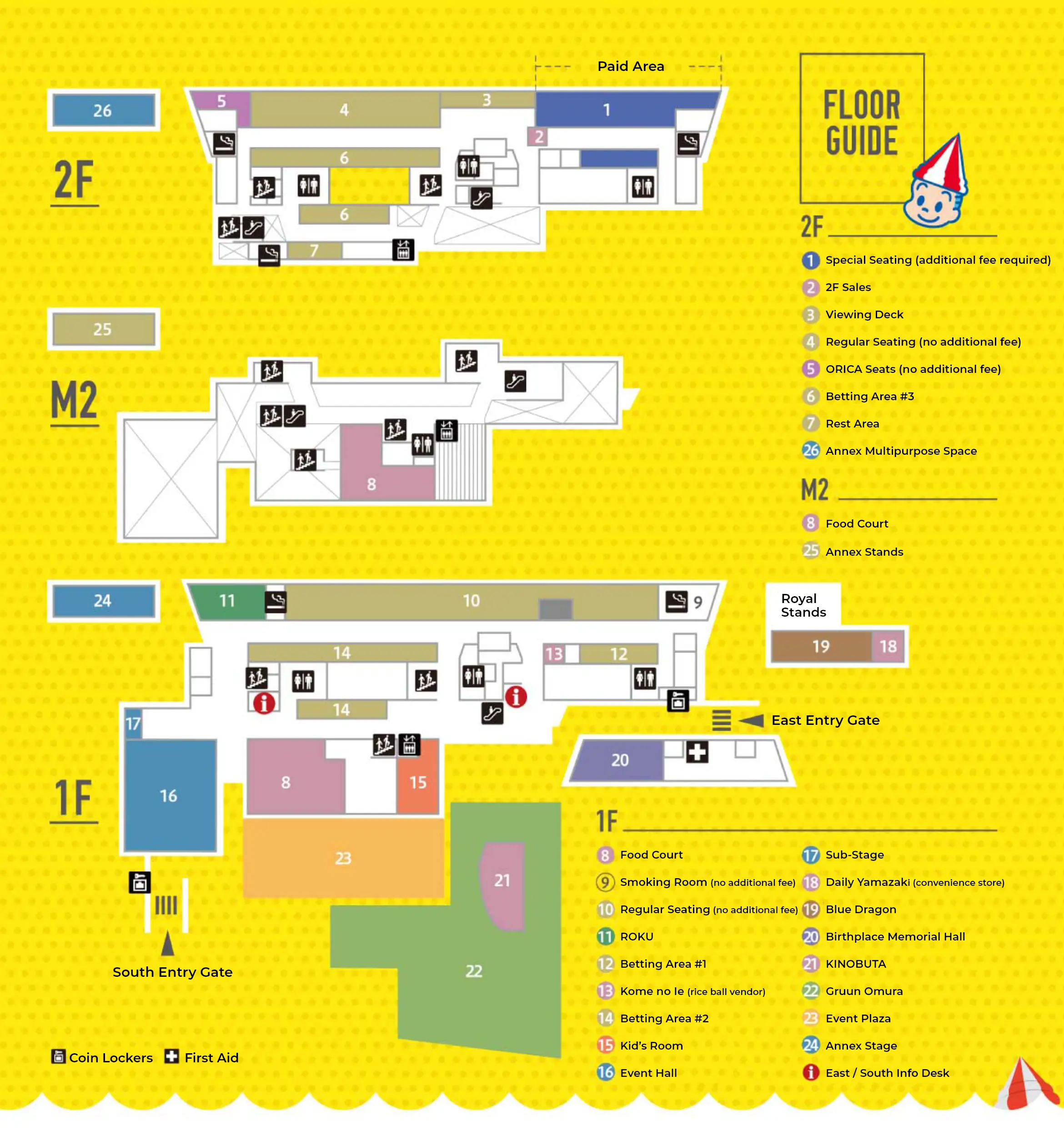 At Boat Race Omura, you’ll find a wide variety of seating options, both indoors or out. You can feel the breeze outside and relax on the artificial turf, or if you want to elevate your experience, there are VIP options as well. For example, for groups who like to kick back in relaxing Japanese-style spaces, the tatami seats are a perfect choice. But if you don't want to take off your shoes, there are also regular group seats and box seats. If you are a single traveler or have one companion along for the ride, your choices span everything from the front row seats to the Royal Stands, another VIP space.