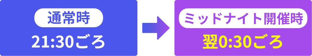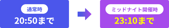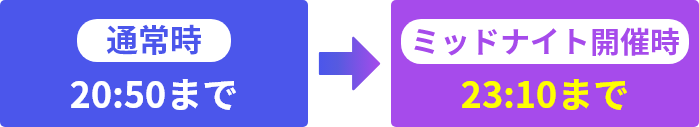 ミッドナイトボートレース開催日の投票サービスへの影響についてご確認くださいませ ミッドナイトボートレースとは? 12レースの終了時間が21時40分から22時50分頃になるレースです。夜のひと時を今までより長くお楽しみいただけます。 12レースの終了時間が21時40分から22時50分頃になるレースです。夜のひと時を今までより長くお楽しみいただけます。 開催スケジュール・開催概要詳細はこちら 開催スケジュール・開催概要詳細はこちら 時間帯の詳細はこちら レース場での観戦、レース場内への入場はできません。
