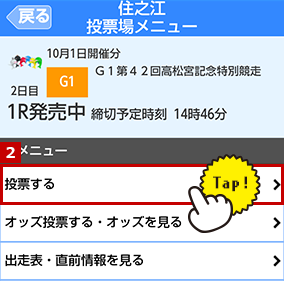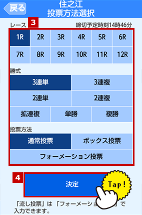 投票方法選択でレース、勝式、投票方法を選択します。