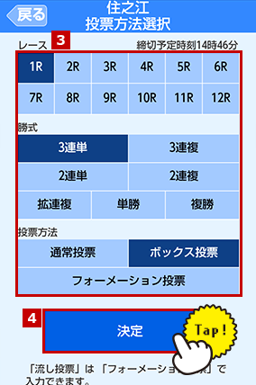 投票方法選択ページでレース、勝式、投票方法を選択します。