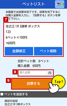投票内容の確認と購入金額を入力します。