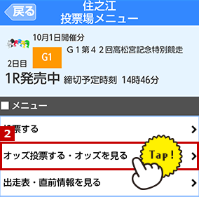 投票場メニューからオッズ投票する・オッズを見るボタンを選択します。