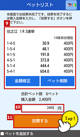 投票内容の確認と購入金額を入力します。