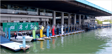 ボートレースでいうピットとは、水面上でモーターボートを係留しておく場所のこと。レースに出走するボートは、ピットで待機し、出走の合図とともにピットから発進する。