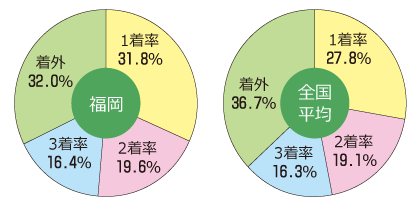福岡の特徴と言えば、3コース1着率の高さ。最近1年間の1着率は15.1%で、戸田や江戸川と並んで全国トップクラスだ。