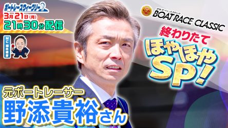 昨年現役引退した野添貴裕さんが登場!「ボートレースウィークリー SGボートレースクラシック 終わりたてほやほやSP!」が明日21時30分からLIVE配信!植木アンバサダーとボートレースについて徹底的に語り合います!終わったばかりのボートレースクラシック振り返りも!BOATCASTとYouTubeで配信です!