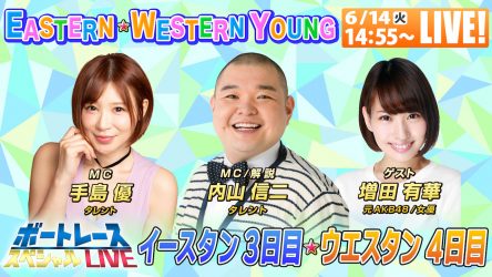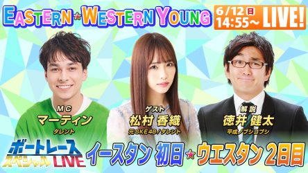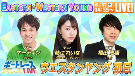 ヤングダービーの切符を賭けたヤングレーサーたちの戦い、福岡「G3ウエスタンヤング」と津「G3イースタンヤング」を初日から最終日までYouTubeでライブ配信!豪華出演者と共にボートレースと舟券予想を楽しめる配信を無料でお送りします。またBOATCASTでも同時配信します!