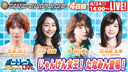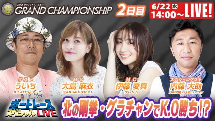 SGで活躍したレーサーしか出場することができないハイグレードなレース、SG「グランドチャンピオン」を初日から最終日までYouTubeでライブ配信!豪華ゲストと共にボートレースと舟券予想を楽しめる配信を無料でお送りします。またBOATCASTでも同時配信します!