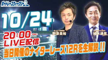 10月24日(月)は20時から「ボートレースウィークリー」をLIVE配信!今回は野添貴裕さんがリモート出演!植木通彦ボートレースアンバサダーと当日開催のナイターレース12Rを生推理!YouTubeとBOATCASTで配信です!