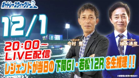 12月1日(木)20時から「ボートレースウィークリー」をLIVE配信!今回はレジェンド今村 豊さんがリモート出演!植木通彦ボートレースアンバサダーと地元下関G1 12Rなどを生推理!YouTubeとBOATCASTで配信です!