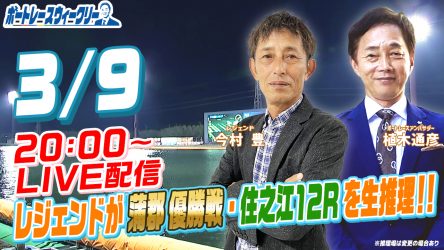 3月9日(木)20時から「ボートレースウィークリー」をLIVE配信!今回はレジェンド今村 豊さんがリモート出演!植木通彦ボートレースアンバサダーと【蒲郡優勝戦・住之江12R】を生推理!YouTubeとBOATCASTで配信です!