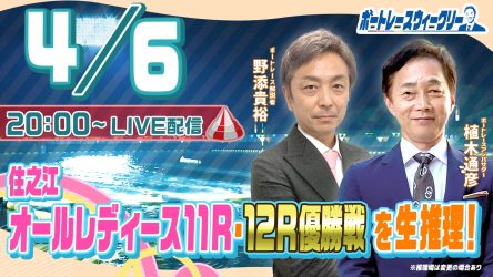 4月6日(木)20時から「ボートレースウィークリー」をLIVE配信!野添貴裕さんがリモート出演!植木通彦ボートレースアンバサダーと住之江オールレディース優勝戦を生推理!YouTubeとBOATCASTで配信!