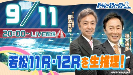 9月11日(月)20時から「ボートレースウィークリー」をLIVE配信!わかりやすい推理で評判の野添貴裕さんがリモート出演!植木通彦ボートレースアンバサダーと【若松11R準優勝戦・12R】を生推理!YouTubeとBOATCASTで配信!