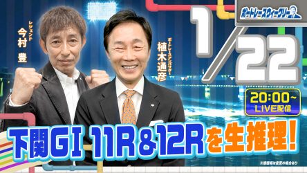 1月22日(月)20時から「ボートレースウィークリー」をLIVE配信!レジェンド今村豊さんがリモート出演!植木通彦ボートレースアンバサダーと【下関G1 11R&12R】を生推理!YouTubeとBOATCASTで配信です!