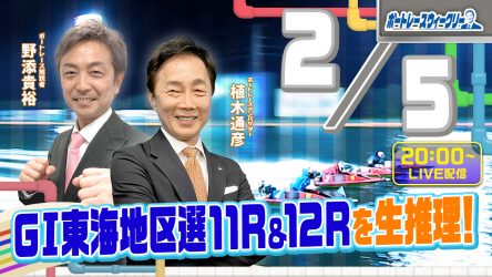 2月5日(月)20時から「ボートレースウィークリー」をLIVE配信!切れ味鋭い推理で人気の野添貴裕さんがリモート出演!植木通彦ボートレースアンバサダーと【蒲郡G1東海地区選手権】を生推理!YouTubeとBOATCASTで配信!