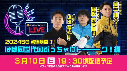 3月10日(日)19時30分から桐生順平選手、中田竜太選手、藤原啓史朗選手がトークライブを開催!! 「~2024SG戦線幕開け!ほぼ同世代のぶっちゃけトーーーク!編~」をBOATCASTとBOATRACE公式YouTubeで生配信!