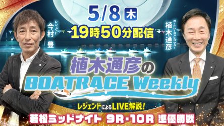 今回の「植木通彦のボートレースウィークリー」は5月8日(木)19時50分からLIVE配信!今村豊さんがリモート出演!植木通彦ボートレースアンバサダーと【若松ミッドナイト準優勝戦】をLIVE解説!