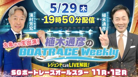 今回の「植木通彦のボートレースウィークリー」は5月29日(木)19時50分からLIVE配信!濱村芳宏さんが丸亀から出演!植木通彦ボートレースアンバサダーと【ボートレースオールスター11R・12R】をLIVE解説!