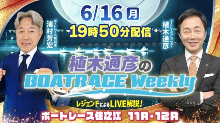 今回の「植木通彦のボートレースウィークリー」は6月16日(月)19時50分からLIVE配信!濱村芳宏さんがリモート出演!植木通彦ボートレースアンバサダーと【住之江11R・12R】をLIVE解説!