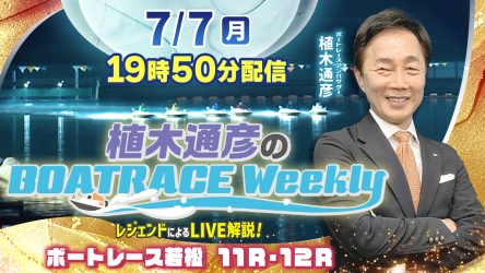 今回の「植木通彦のボートレースウィークリー」は7月7日(月)19時50分からLIVE配信!今回は植木通彦ボートレースアンバサダーと【ボートレース若松11R・12R】をLIVE解説!