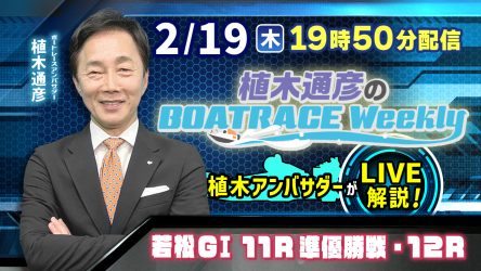 今回の「植木通彦のボートレースウィークリー」は2月19日(木)19時50分からLIVE配信!今回は植木通彦ボートレースアンバサダーが【若松G1 11R準優勝戦・12R】をLIVE解説!質問も大募集!