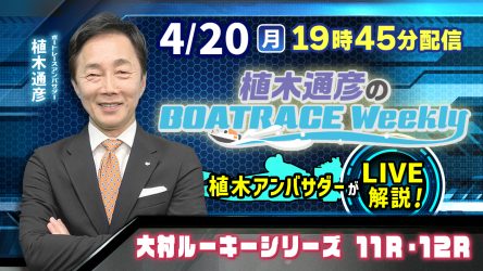今回の「植木通彦のボートレースウィークリー」は4月20日(月)19時45分からLIVE配信!今回は植木通彦ボートレースアンバサダーが【大村ルーキーシリーズ 11R・12R】をLIVE解説!質問も大募集!