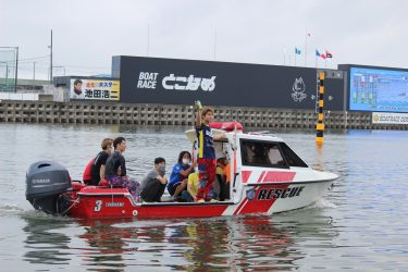 水神祭では、多くの選手関係者から祝福されました。右手にチップスターを掲げ「愛知支部の大先輩、赤岩選手からいただいた、チップスターのおかげで初一着がとれました。」と嬉しそうに語りました。