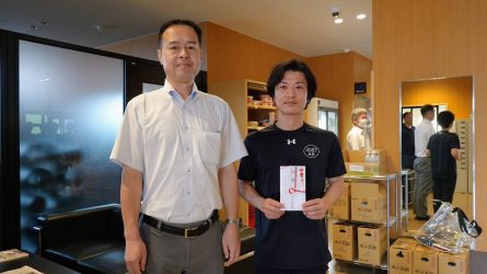 初日第10レースにおいて、登録第4067号永井 源選手(愛知支部)が2コースから見事まくりにて、通算1,500勝を達成しました。永井選手には越前三国ボートレース企業団長谷川事業局次長より金一封が贈られました。