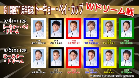 「G1開設71周年記念トーキョー・ベイ・カップ」初日(9月4日)・2日目(9月5日)に実施のWドリーム戦出場予定選手が決定しました!実力者同士の熱いレースにぜひご期待ください!!