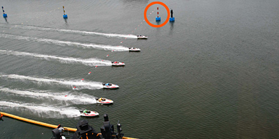 センターポールから第2ターンマークの方に向かって5mの位置に立っている標識ポール。赤と白で交互に塗り分けられている。この5m標識ポールからはコースを横切る形で空中線標識がのびている。これはロープに赤と白の正三角形の小旗がついたもの。レーサーはこの小旗のゆれ具合でも風向き・風速を計算している。
