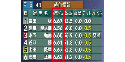 直前情報とは各レーサーのレース直前のデータである。展示航走で計測された展示タイムや体重などが載っている。また、その日2回走りであれば前走の成績も記載されている。