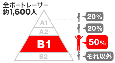 全レーサーのうちA級(A1、A2)を除いた上位50%まで。最も人数の多いクラスであり、上位と下位のレーサーではかなり実力の開きがあるといえる。
