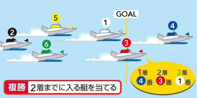 1着か2着に入る艇を当てる。つまり、選んだボートが1着でも2着でも当たり。単勝式よりも的中率は高くなる分、払戻し金額は低くなる傾向にある。的中率1/3。