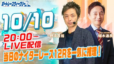 10月10日(月)20時から「ボートレースウィークリー」をLIVE配信!10月からリニューアル!今回は野添貴裕さんがリモート出演!植木通彦ボートレースアンバサダーと当日開催のナイターレース 最終12Rを一気に推理!YouTube とBOATCASTで配信です!