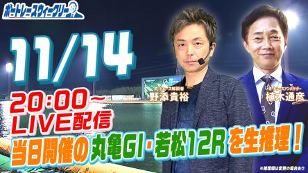 11月14日(月)20時から「ボートレースウィークリー」をLIVE配信!今回は切れ味鋭い推理が好評の野添貴裕さんがリモート出演!植木通彦ボートレースアンバサダーと当日のナイターレースを生推理!YouTube とBOATCASTで配信です!