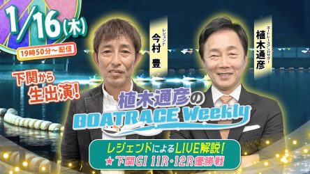 今回の「植木通彦のボートレースウィークリー」は1月16日(木)19時50分からLIVE配信!今村豊さんが下関からリモート出演!植木通彦ボートレースアンバサダーと【下関G1 11R・12R優勝戦】をLIVE解説!