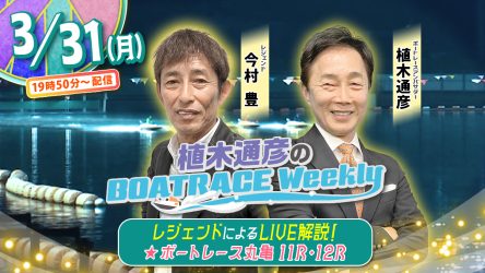 今回の「植木通彦のボートレースウィークリー」は3月31日(月)19時50分からLIVE配信!今村豊さんがリモート出演!植木通彦ボートレースアンバサダーと【丸亀11R・12R】をLIVE解説!