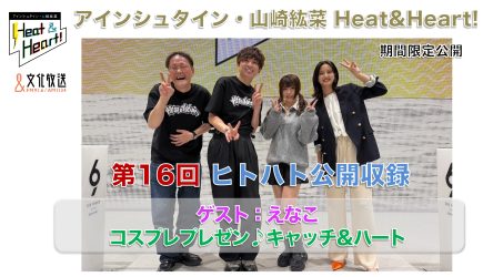 文化放送「アインシュタイン・山崎紘菜 Heat & Heart!」公開収録の模様をYouTubeで期間限定公開中!ゲストは人気コスプレイヤー・えなこさん!