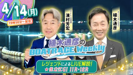 今回の「植木通彦のボートレースウィークリー」は4月14日(月)19時50分からLIVE配信!濱村芳宏さんがリモート出演!植木通彦ボートレースアンバサダーと【住之江G1 11R・12R】をLIVE解説!