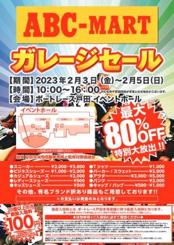ボートレース戸田では、アウトレット商品等が最大80%OFFとなる「ABC-MARTガレージセール」を実施いたします。シューズだけでなく、Tシャツやパーカー等もご用意しております。