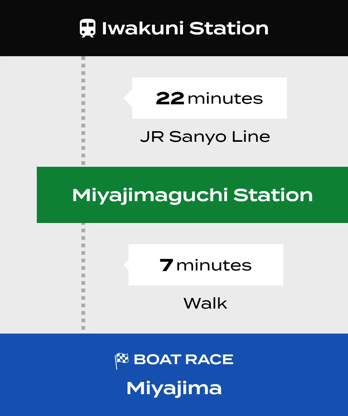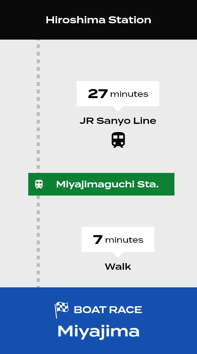 Getting to Boat Race Miyajima is easy and convenient—it’s just a short train ride from the bustling city center of Hiroshima! There is a direct, hassle-free route to Miyajimaguchi Station, and the venue itself is a quick seven-minute walk from there. This makes Boat Race the perfect thing to spend an afternoon on after visiting the famous island of Miyajima.