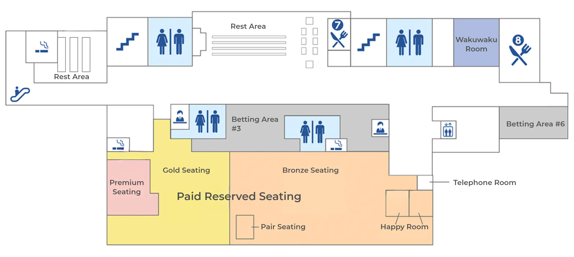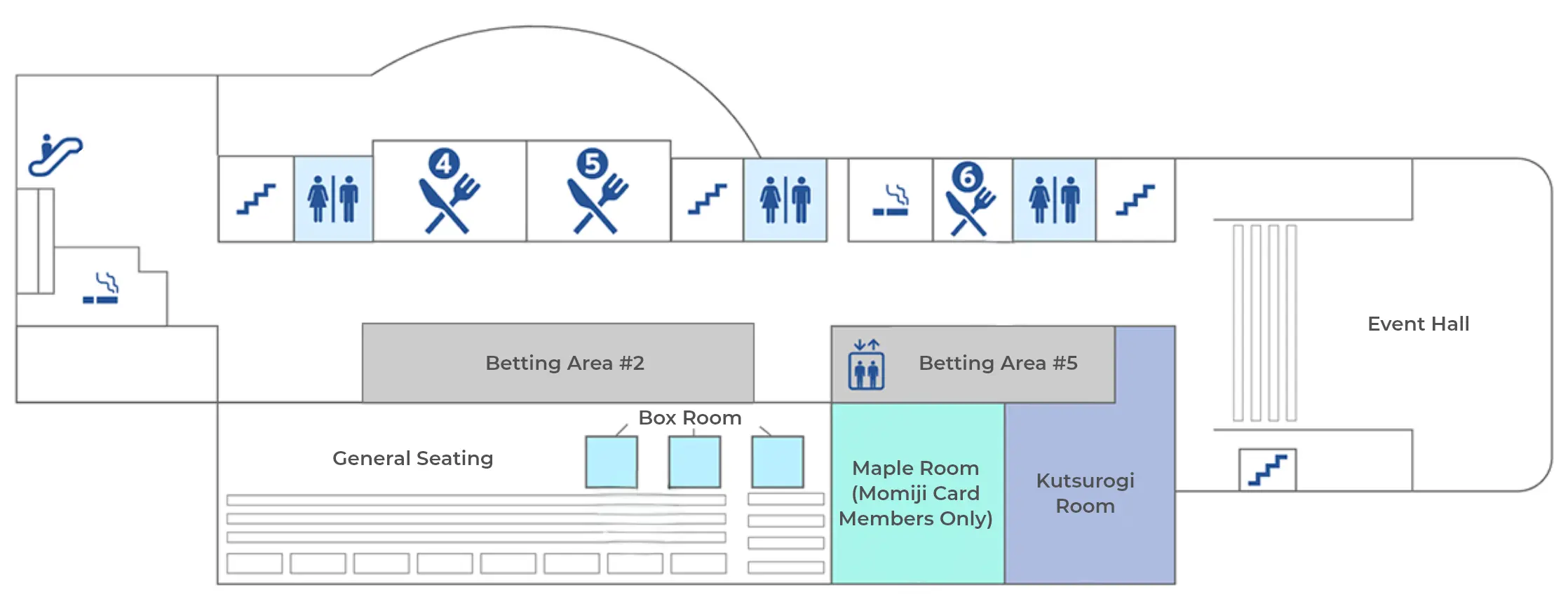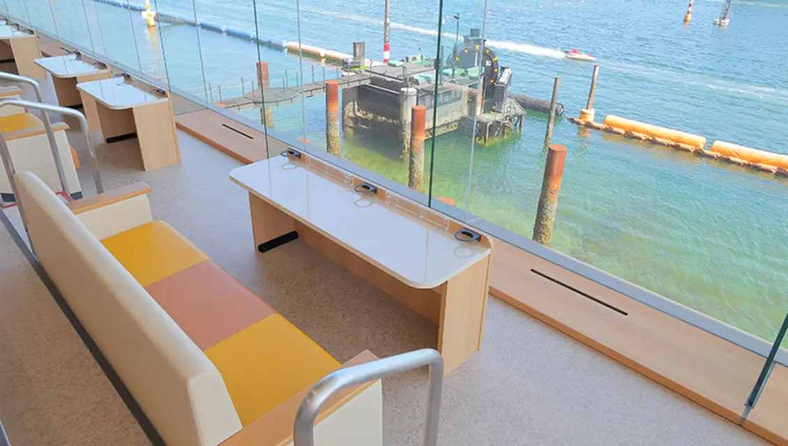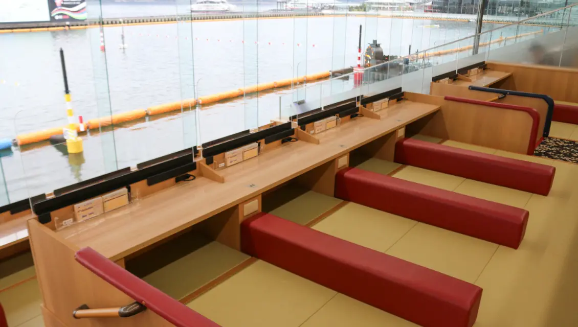 In addition to watching the races close to the water’s edge, there are many options for an elevated perspective. As for how elevated and how comfortable, there’s plenty to choose from! The third floor has general seating, including individual chairs or sofas for groups, as well as a special “Kutsurogi Room” (Relaxation Room), the perfect spot for families with small children to stretch out on tatami flooring (only open on big race days, only for families with children up to junior high school age). The fourth floor has premium options like reserved upscale seating for lone visitors and private rooms for groups. There’s bound to be a view, seat, and atmosphere to suit every taste and budget.