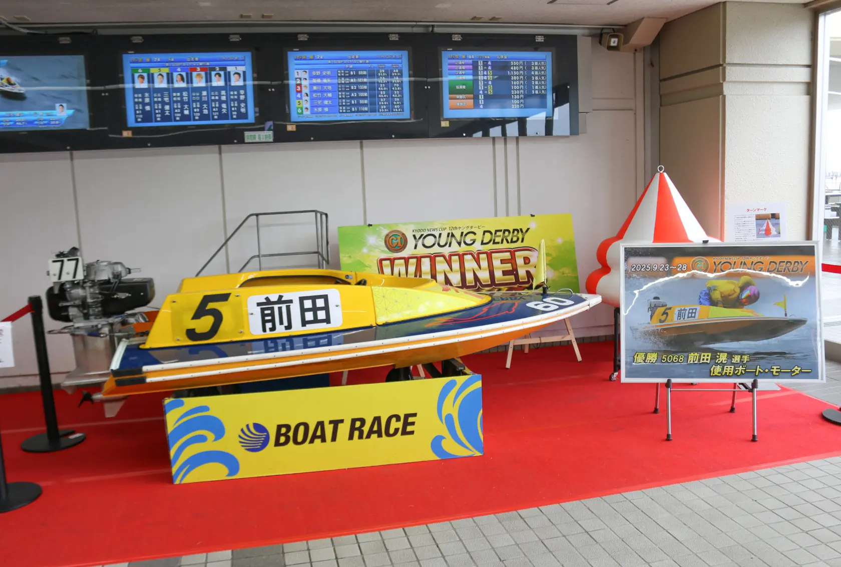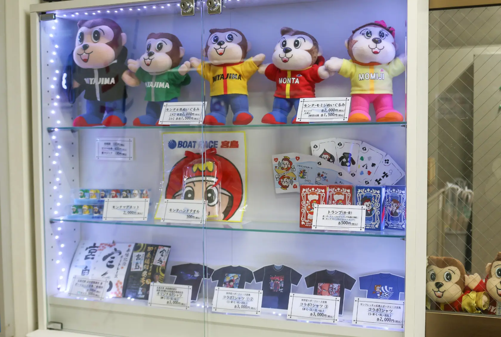 Another popular attraction at the venue is the real motorboat displayed on the first floor! With its refined form and down-to-basics functionality, it is the epitome of a racing machine. Many guests take the opportunity to climb aboard for a commemorative photo. On this floor, you can also find the Service Corner. This is where you can buy exclusive goods featuring the Boat Race Miyajima mascots—our two cute monkeys, Monta and Momiji! Since every venue has its own mascot, you won’t be able to find these unique souvenirs anywhere else.