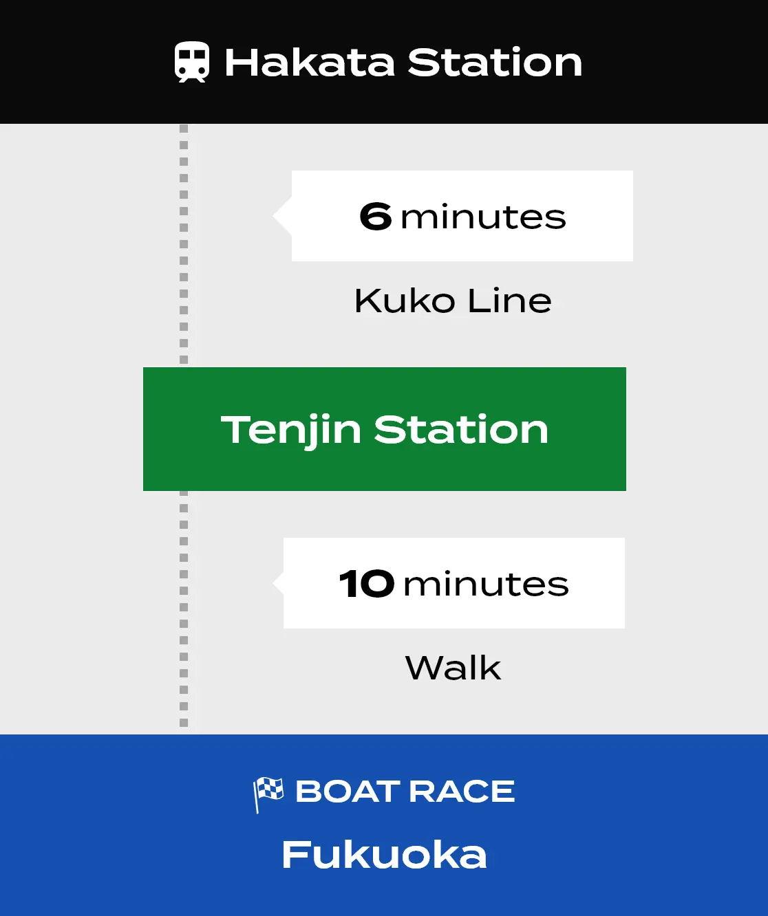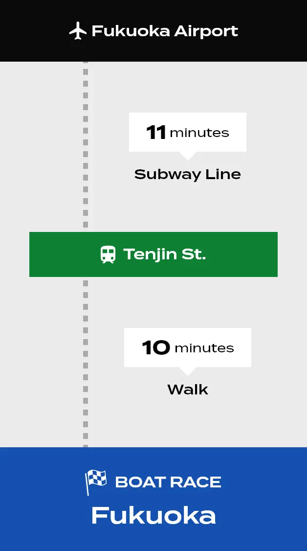 Boat Race Fukuoka has a prime location about 15 minutes on foot from Tenjin, the main shopping area of Fukuoka. It is about 20 minutes from Hakata Station by bus, and 10 minutes from Fukuoka Airport to Tenjin via the Fukuoka City Subway, making it very easy to get to.