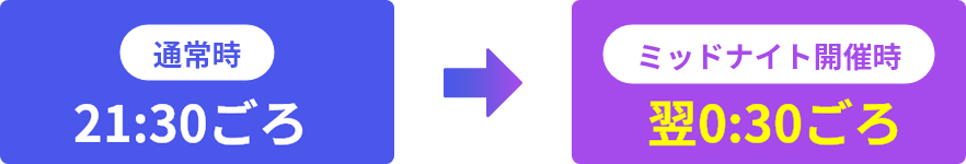 ミッドナイトボートレース開催日の投票サービスへの影響についてご確認くださいませ ミッドナイトボートレースとは? 12レースの終了時間が21時40分から22時50分頃になるレースです。夜のひと時を今までより長くお楽しみいただけます。 12レースの終了時間が21時40分から22時50分頃になるレースです。夜のひと時を今までより長くお楽しみいただけます。 開催スケジュール・開催概要詳細はこちら 開催スケジュール・開催概要詳細はこちら 時間帯の詳細はこちら レース場での観戦、レース場内への入場はできません。
