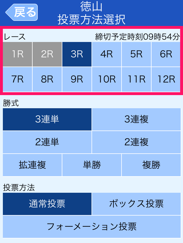 | パターンに「投票」・「オッズ投票」を設定した場合、表示される投票画面は当回レースになります。 レースを変更する場合は画面下の勝式等変更ボタンから変更できます。 パターンに「投票」を設定した場合