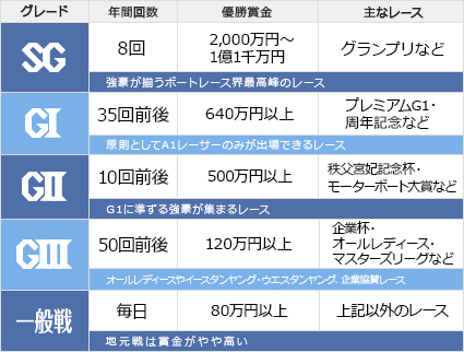 レースの格付けの一つ、読み方は「グレード・ワン」。原則としてA級レーサーだけが出場できるレース。「プレミアムG1」「地区選手権」「高松宮記念」「周年記念」など。(2025年4月1日時点)