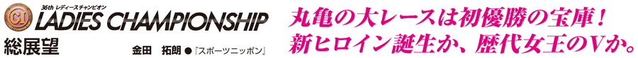 丸亀の大レースは初優勝の宝庫。代表格は池田浩二、石野貴之、峰竜太で、7年前の滝川真由子(長崎)もそう。今回、細川裕子(愛知)、長嶋万記(静岡)が悲願達成なるか。櫻本あゆみ(群馬)、香川素子(滋賀)の丸亀巧者2人が穴。