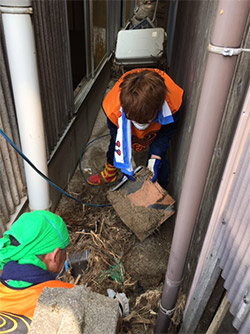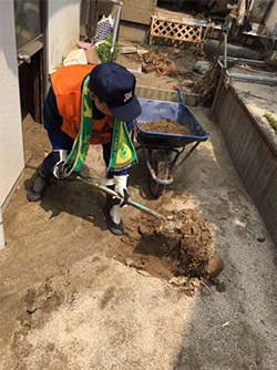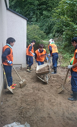 今回、個人宅家屋内でのボランティア活動が展開され、庭先などの土砂が大量に堆積している場所での作業となりました。朝から活動を開始し、民家の庭先に堆積した土砂および漂流物をスコップで、「ネコ」と呼ばれる一輪車に載せ、集積所まで運ぶ作業を手分けして行いました。